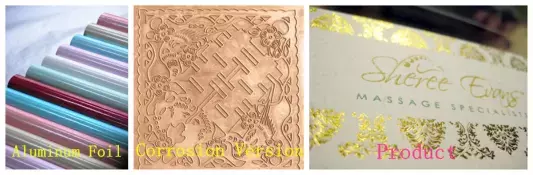 Tietyssä lämpötilassa ja paineessa alumiinifoliosiirto tuotteen pintaan, erilaiset kuviot ja sanat erilaisella sinkillä tai kuparikorroosioversiolla.